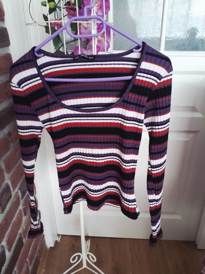 Fitted uzun kollu, yuvarlak yakalı, koyu renkli çok renkli çizgili triko kazak. Rahat ve retro bohem tarzında, günlük ve sokak giyimi için uygundur.