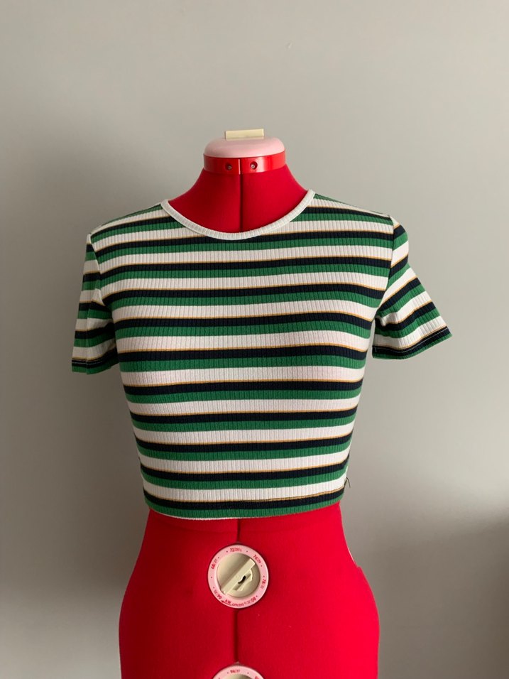 Renkli çizgili, kısa kollu, tekne yaka ve pileli kumaştan yapılmış bohem tarzı crop top.