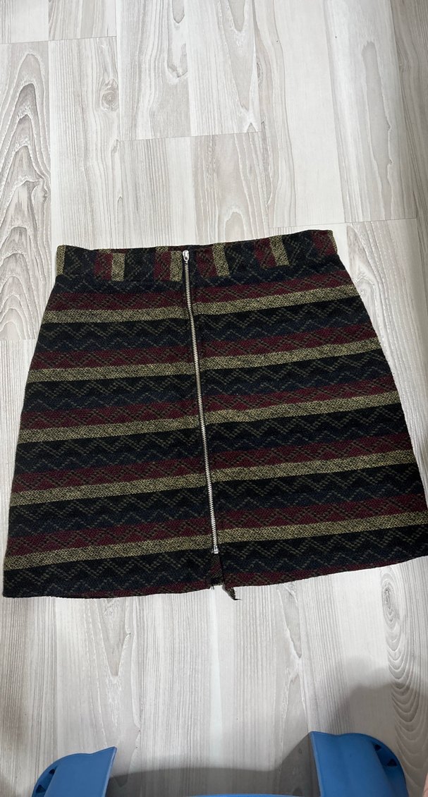 Sentetik kumaştan, fermuarlı, çizgili, koyu renkli bohem tarzda, kısa ve vücuda oturan mini etek.