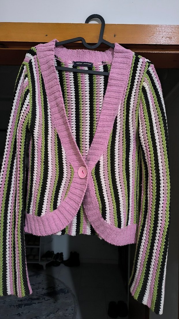 Bu dar kesim hırka, notlu yakası ve askılı kollarıyla pastel renkli çizgili örgüden yapılmıştır. Bohem ve rahat bir tarz sunar.