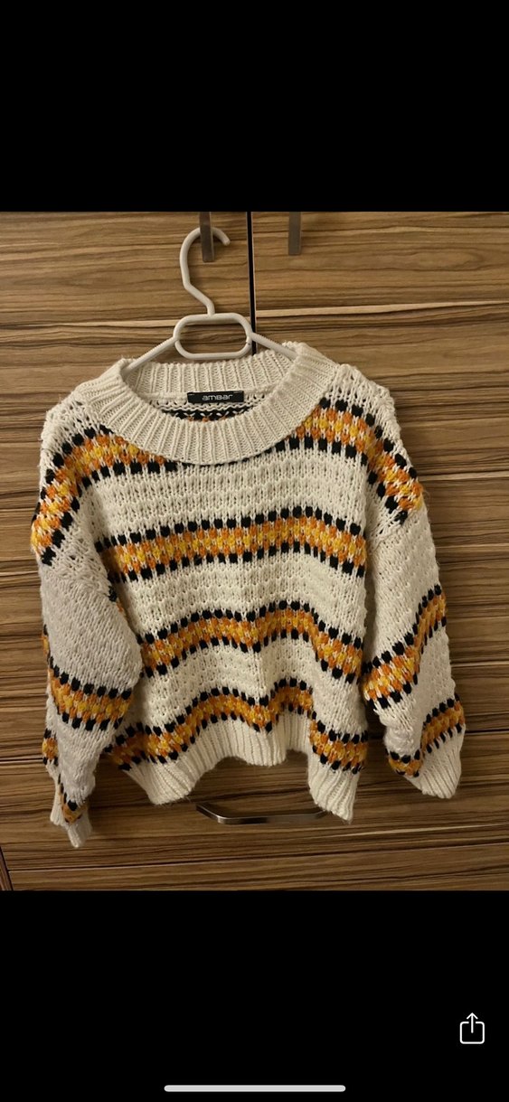 Çok renkli çizgili desene sahip, bol kesim ve uzun kollu örgü kadın kazak. Bohem tarzıyla günlük kullanıma uygun, rahat ve sıcak tutar.