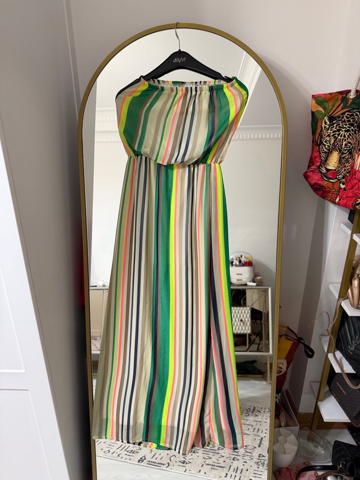 Renkli çizgili, straplez ve bol kesim uzun elbise, sentetik kumaştan, drapeli tasarımlı. Bohem tarzı için uygun.