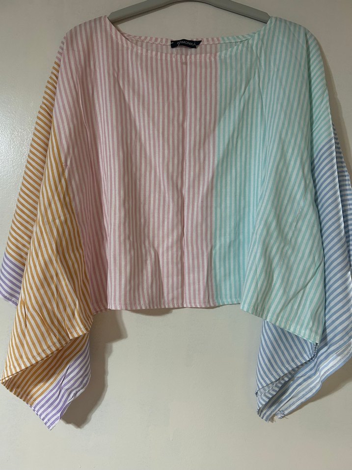 Pamuk kumaştan yapılmış, pastel renklerde çizgili, bol kesimli, kısa kollu ve drapeli kadın gömleği. Tekne yaka ve midi boyda, günlük bohem tarz için uygundur. Dolabımı boşaltıyorum hiç giyilmedi fiyatı uygun tutulmuştur