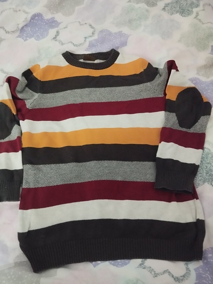 Salaş kesim, uzun kollu, yuvarlak yaka triko kazak. Çok renkli çizgili desenlerle günlük ve sokak stiline uygun rahat bir model.