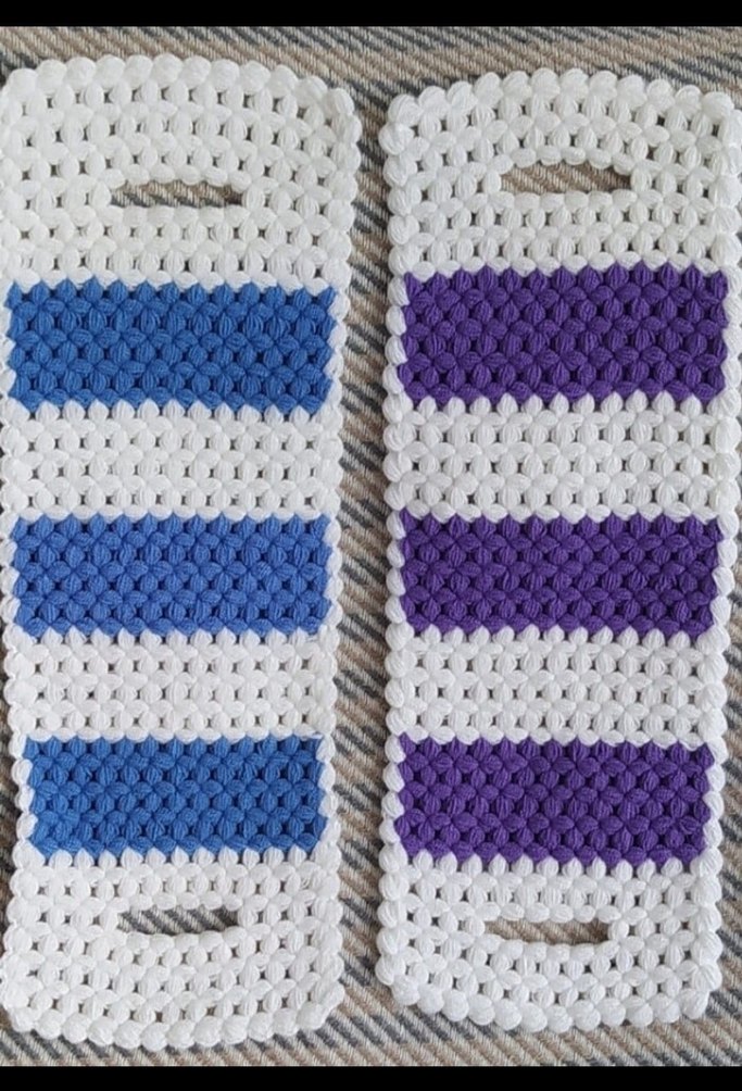 Mavi ve mor çizgili beyaz banyo süngerleri, kolay kullanım için saplıdır. Yumuşak dokusu ile konforlu banyo sağlar.