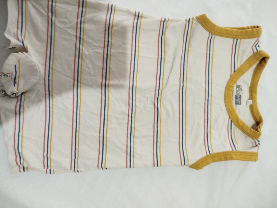 Çocuklar için çok renkli çizgili desenli, kol ve yaka kenarları hardal sarısı olan yumuşak ve rahat yazlık şort gibi alt bacak kısmı