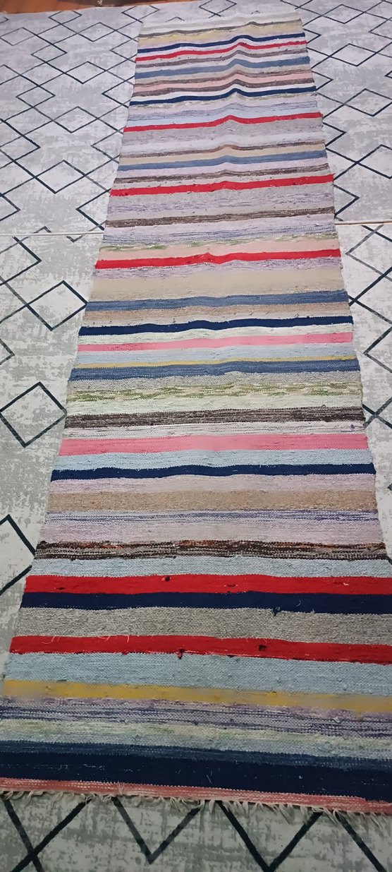 Bohem tarzda, hafif tonlarda çok renkli çizgilerden oluşan yumuşak dokulu bir halı, mekana canlılık katar.
