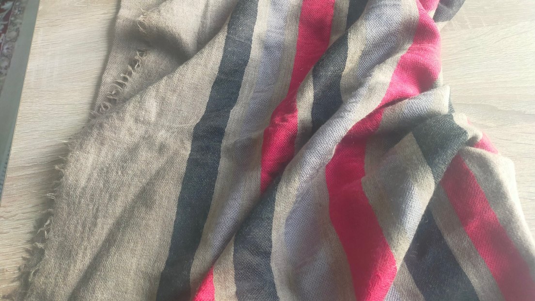 Çok renkli çizgili, belirgin gri tonlu, yumuşak ve yünlü şal Ufak bir lekesi var çıkar diye düşünüyorum
