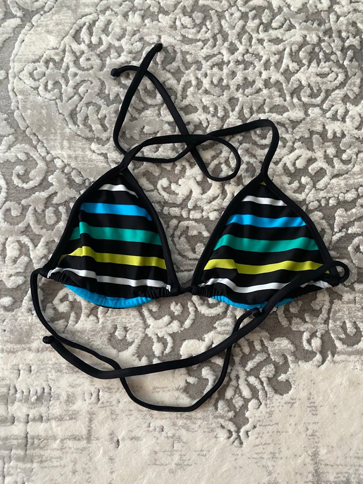 Kadın bikini üstü, koyu çok renkli çizgilerle, sıkı ve kısa kesim, elastik destekli. İnce askılı, plaj için athleisure tarzında.