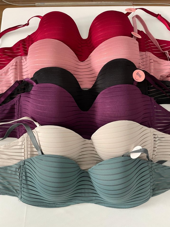 Çizgili dokulu, çok renkli sütyenler; kırmızı, pembe, siyah, mor, beyaz ve yeşil tonlarında, rahat ve çağdaş tasarımda, ayarlanabilir askılı midi uzunlukta.tüm bedenler mevcuttur