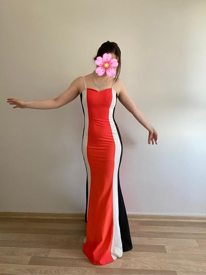 Elbisenin boyu 150cm civarı. Boyum 170 cm ve 8 cm topuklu var fotoğraflarda. Normalde strablez ama askıları kendim yaptırmıştım çıkarılabilir. Kuru temizlemesi yapılmadı.