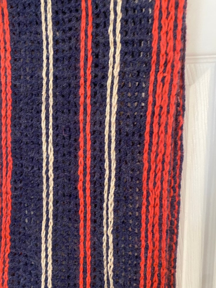 Çizgili desenli, koyu renk tonlarında çok renkli, uzun ve rahat bohem tarzda atkı. Retro ve hippie esintileri taşır.