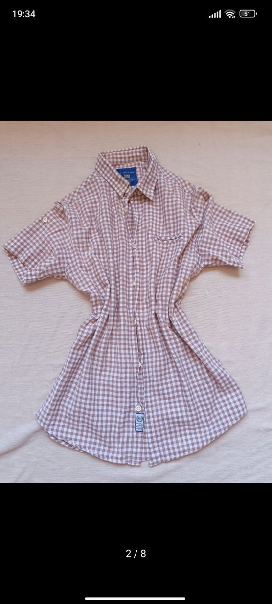 Kare Çizgili Dede Gömlek – M Beden Hafif, kare çizgili, açık kahverengi, krem ve beyaz tonlarında M beden dede gömlek