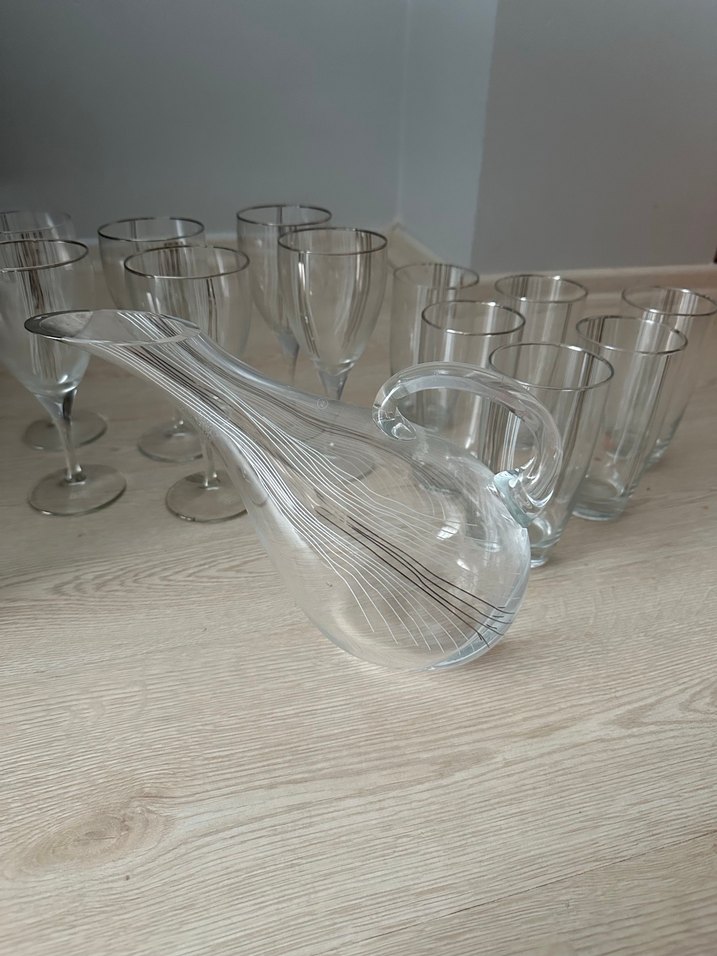 İnce çizgilerle süslenmiş şeffaf cam sürahi ve uyumlu cam bardak seti, içecek servisleri için uygundur.