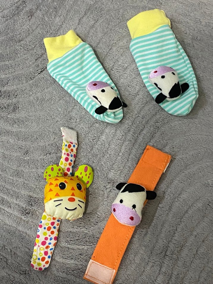 Renkli çizgili bebek eldivenleri ve sevimli hayvan figürlü bileklik oyuncakları, yumuşak ve sıcak kumaştan üretilmiştir. Az kullandık temiz sorunsuz