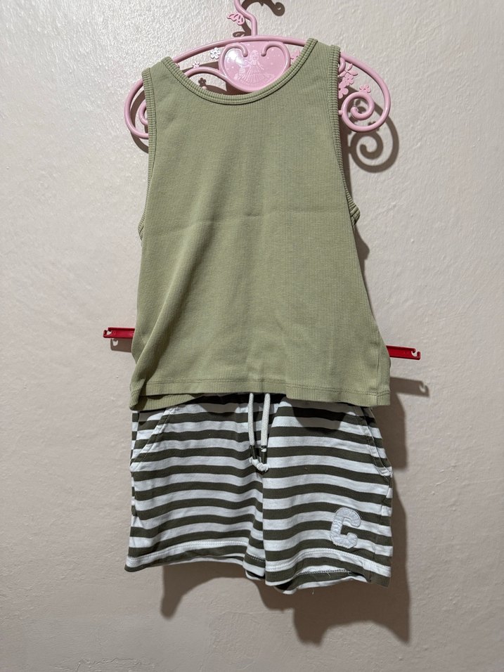 Kolsuz yeşil üst ve çizgili gri şortlu çocuk takımı, rahat kullanım sağlar. Pamukludur ve hafif esnektir, giyildiğinde rahat hissettirir. orijinal Defacto ürünüdür ve hiçbir problemi yoktur. Kızıma küçüldüğü için satıyorum