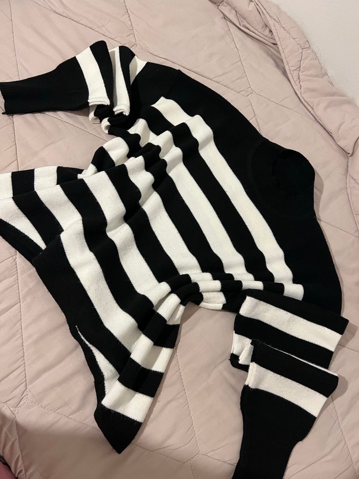 Uzun kollu, tekne yaka kesime sahip, siyah beyaz çizgili, kadın kazak.