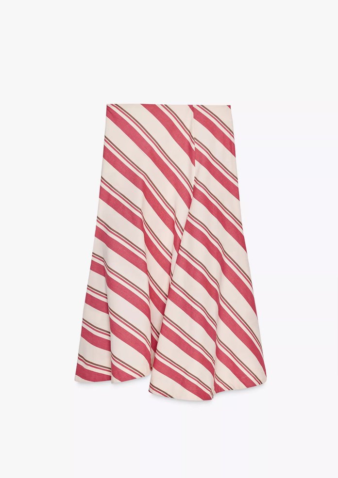 Yumuşak sentetik kumaştan, açık kırmızı çizgili, uzun ve drapeli hamile eteği. Günlük kullanım için rahat kesime sahiptir.
