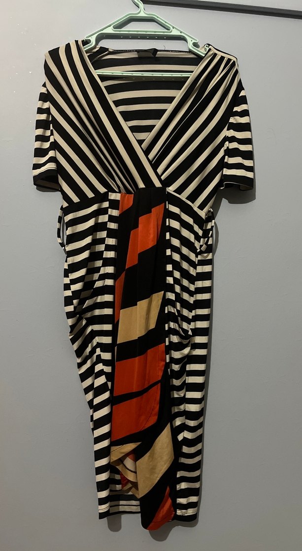 V yaka ve askılı kollara sahip, drapeli ve çizgili uzun hamile elbisesi. Günlük kullanıma uygun, çağdaş tarzda çok renkli desenli.