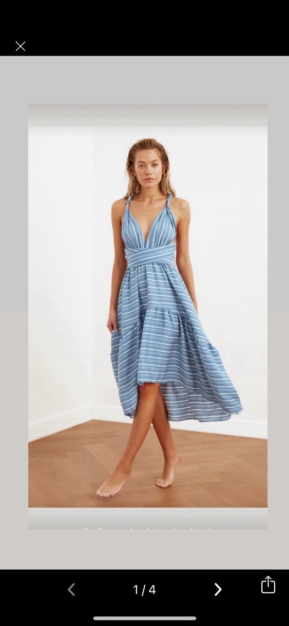 Çizgili, drapeli, V yakalı ve askılı uzun elbise. Rahat kesimiyle bohem tarzını yansıtır.