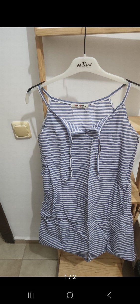 Mavi ve gri çizgili, düğmeli, V yakalı, askılı pamuklu hamile elbisesi, rahat kesimli, günlük sokak stili için uygun.