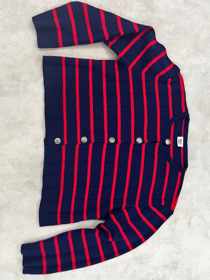 Düğmeli, uzun kollu, yün kumaştan yapılmış, çizgili ve normal boyda, ince kesim kadın hırka. Rahat sokak stiline uygundur.