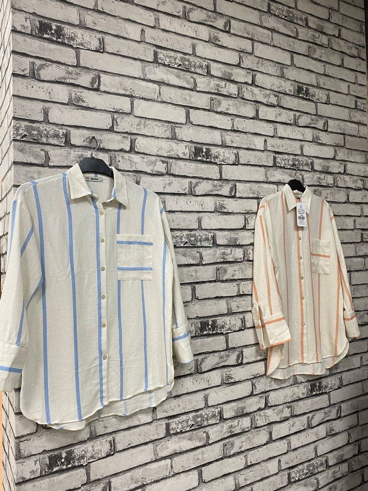 Pamuklu, uzun kollu, düğmeli, çizgili ve salaş kesim kadın gömleği. Tekne yakalı, günlük sokak stili için uygun.