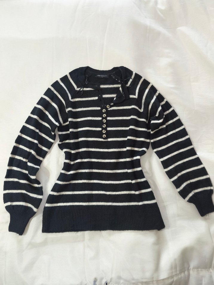 Bu triko kazak uzun kollu, düğmeli ve yakalıdır. Lacivert ve beyaz çizgili, rahat kesimli ve midi boydadır. Günlük sokak stili için uygundur. Hiç giyilmedi.