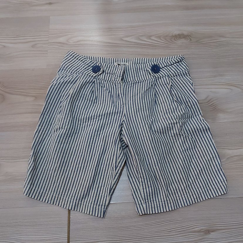 Mavi ve gri tonlarda çizgili, düğmeli, bol kesim mini şort. Rahat ve günlük sokak stili için uygundur.