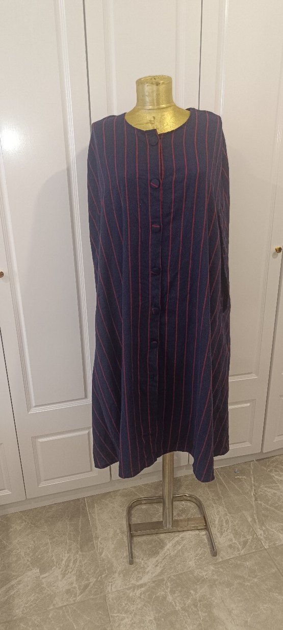 Düğmeli, yakalı uzun,çizgili desende ve kolsuz. Rahat kesimi ve koyu çok renkli tasarımıyla bohem Paris tarzı yansıtıyor.