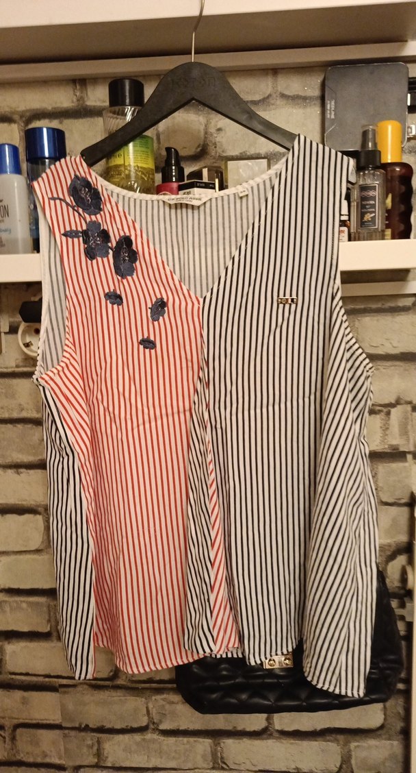 Çok renkli çizgili, düğmeli, V yaka ve nakışlı, salaş kesim kadın bluz. Sokak stiline uygun, kolsuz ve günlük kullanıma uygun.