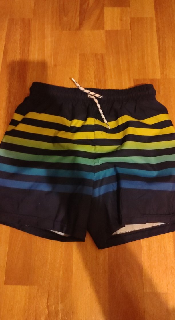 Koyu renkli çok renkli yatay çizgili erkek çocuk deniz şortu, ayarlanabilir bağcıklı bel ile rahat kullanım sağlar.