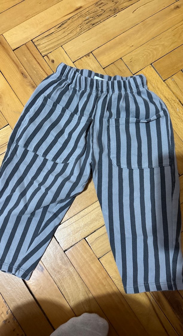 Yumuşak keten kumaştan yapılmış, dikey çizgili ve pile detaylı geniş kesim erkek çocuk pantolonu. Lastikli bel ve ön cepler bulunur.