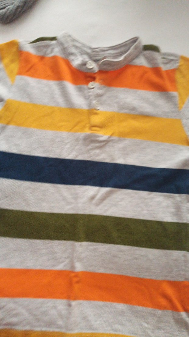 Pamuklu, düğmeli, kısa kollu ve yakalı bu erkek çocuk gömleği, gri, turuncu, sarı, mavi ve yeşil renkli yatay çizgilerle rahat bir kesime sahiptir.