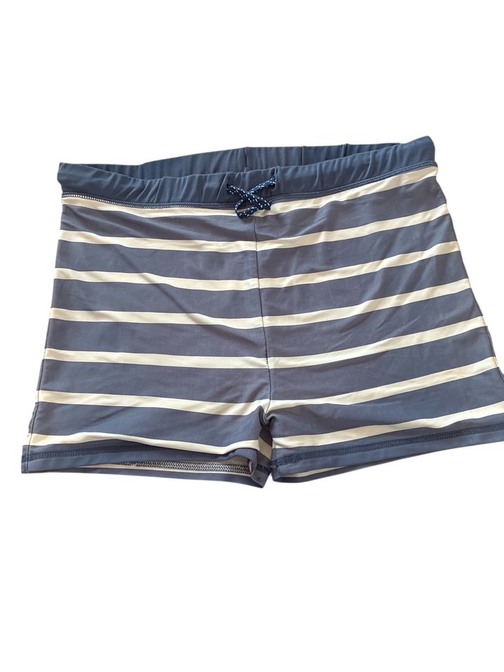 Mavi ve gri çizgili erkek çocuk mayo şortu, elastik bel ve ayarlanabilir bağcık ile rahat kullanım sağlar. Yumuşak kumaştan üretilmiştir.