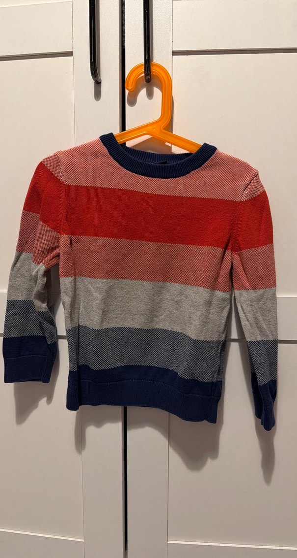 Çizgili desenli, uzun kollu ve bisiklet yaka erkek çocuk triko kazak. Yumuşak örgü kumaştan üretilmiş, rahat ve şık bir sokak stili parçası. Yeni gibi