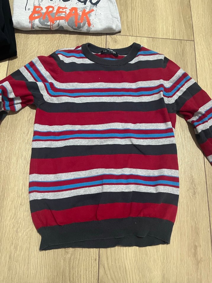 Dar kesim, uzun kollu ve yuvarlak yakalı erkek çocuk yün kazak. Çizgili ve çok renkli, örgü dokulu, rahat sokak stili. Üzerinde 'BREAK' yazısı bulunur.