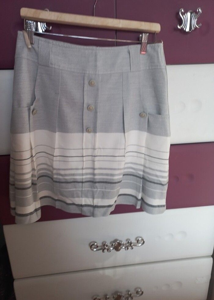 çizgili etek , bel 38 cm, uzunluk 49 cm, açık gri rengi,