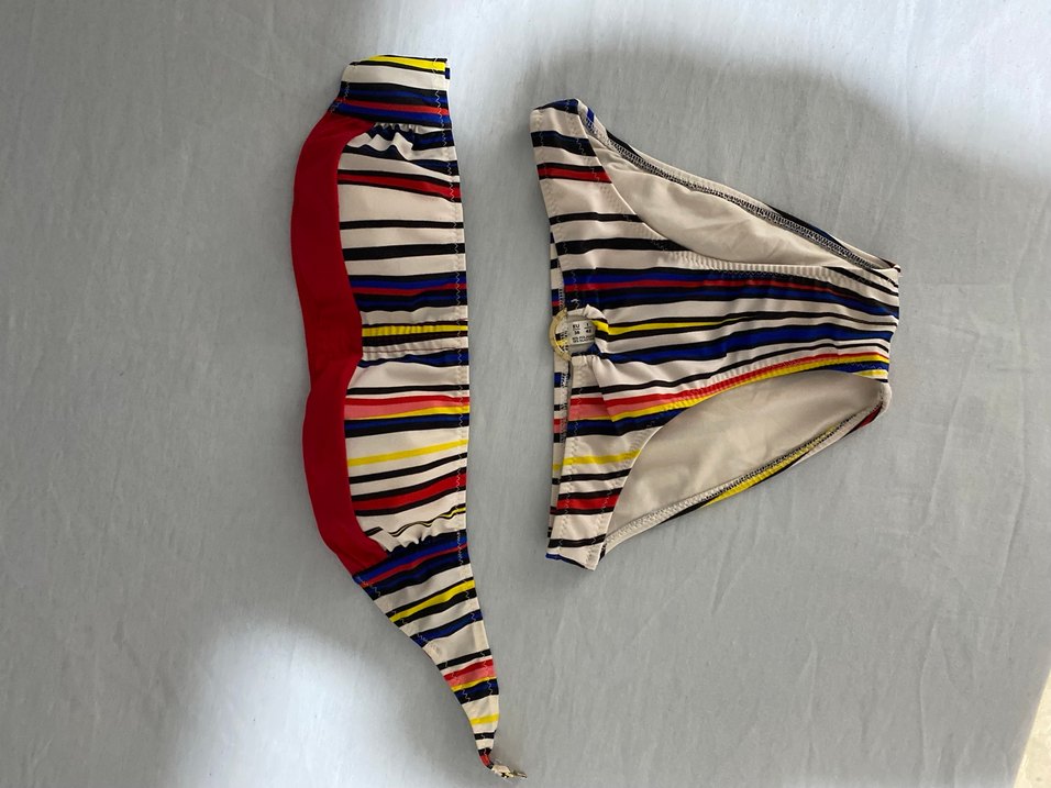 Renkli çizgili, fermuarlı ve askılı detaylara sahip, retro ve avangart tarzda, vücuda oturan kadın bikini takımı.