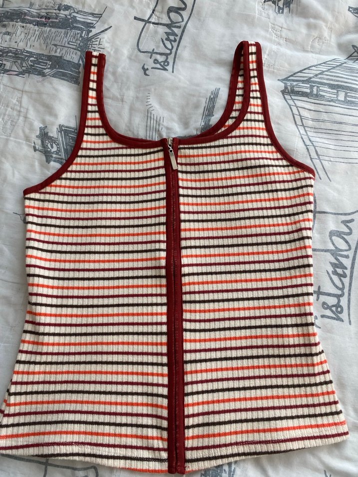 Önden fermuarlı, çizgili, vücuda oturan kolsuz kadın bluz. Yumuşak sentetik kumaştan, günlük ve sokak modasına uygun.