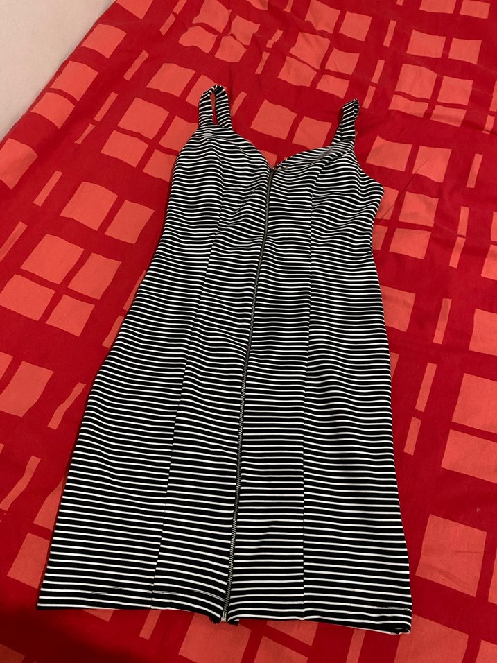 Siyah beyaz çizgili, fermuarlı, kalın askılı mini elbise. Sentetik kumaştan, vücuda oturan kesimde, günlük sokak stiline uygun rahat bir parça.