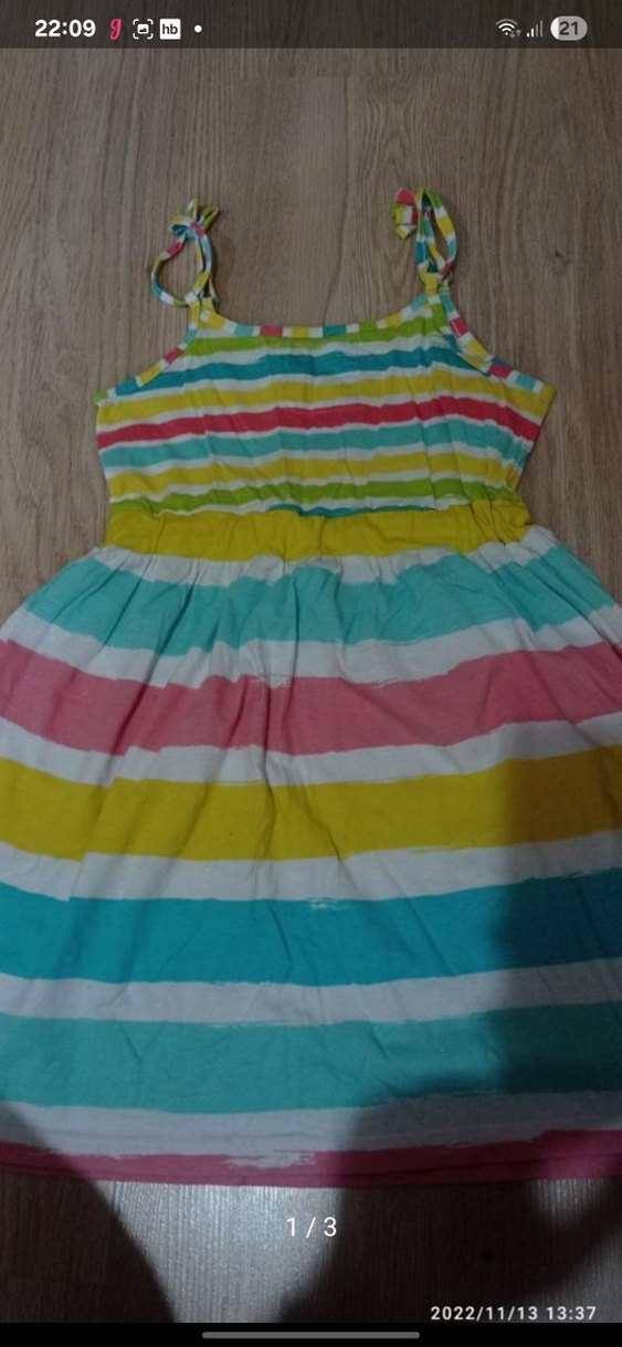 Çok renkli pastel çizgili, askılı, fırfırlı ve tekne yakalı, bohem tarzda kız çocuk elbisesi.