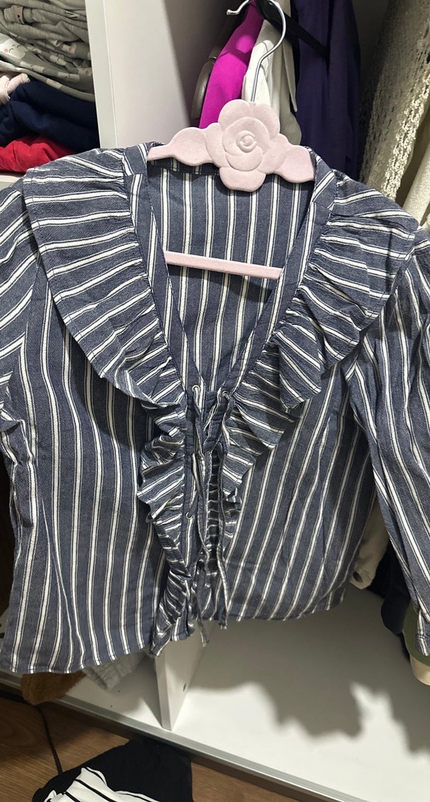 Fırfırlı yakası ve askılı kolları ile çizgili, keten kumaştan yapılmış, vücuda oturan kadın gömleği. Günlük kullanıma uygun, trend sokak stili.