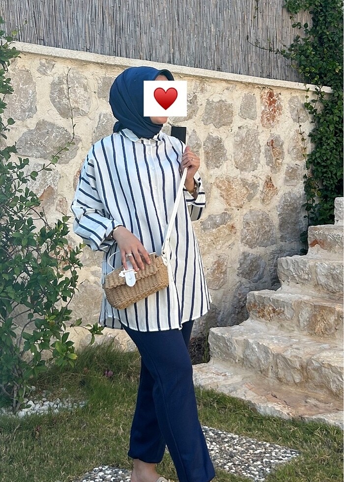Beyaz lacivert çizgili gömlek yumuşak kumaş rahat kalıp 1 kez çekimde kullanıldı