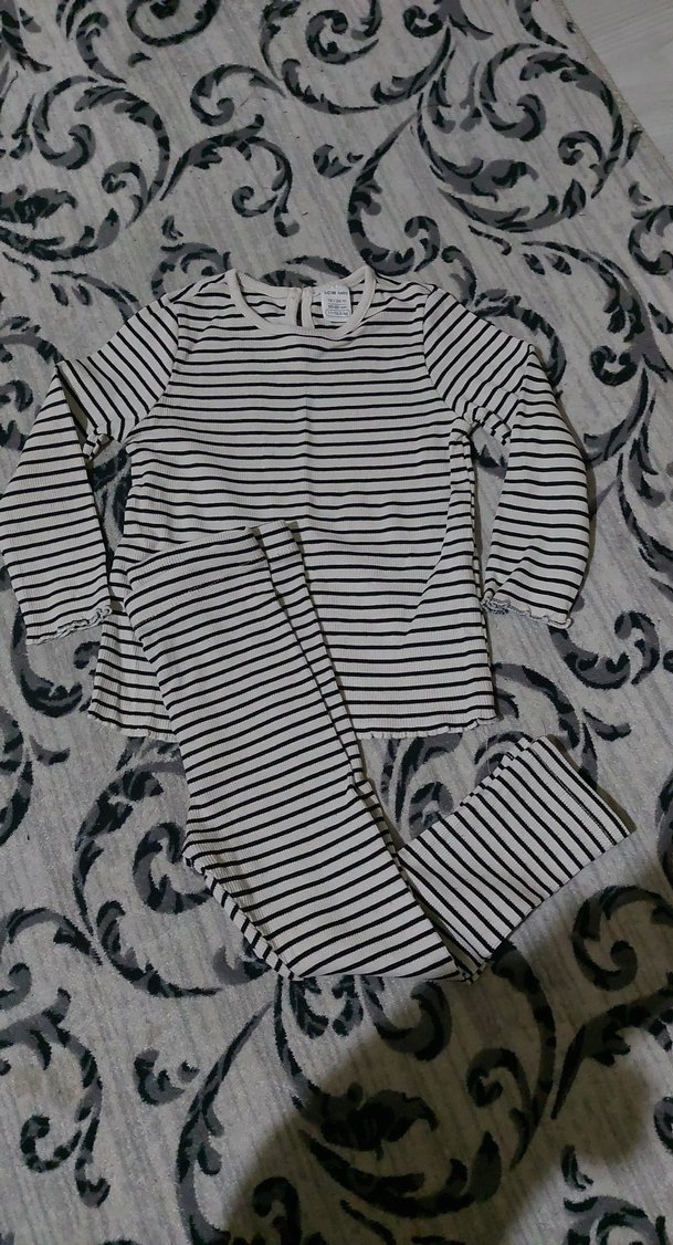 Uzun kollu, yuvarlak yakalı, çizgili gri bebek takımı. Likralı esnemesi mevcut hiç bir kusuru yok.