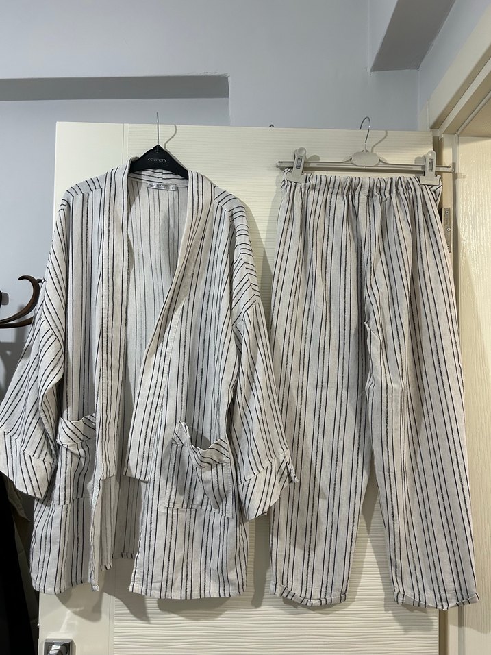 Gri ve beyaz çizgili pantolon seti, rahat kesimi ve bornozdaki ceplerle konforlu kullanım sunar. Yumuşak kumaştan, bohem tarzda. Hiç bir sorunu yoktur harika giy çık takım ALT BOY 86 cm ÜST BOY 75 cm