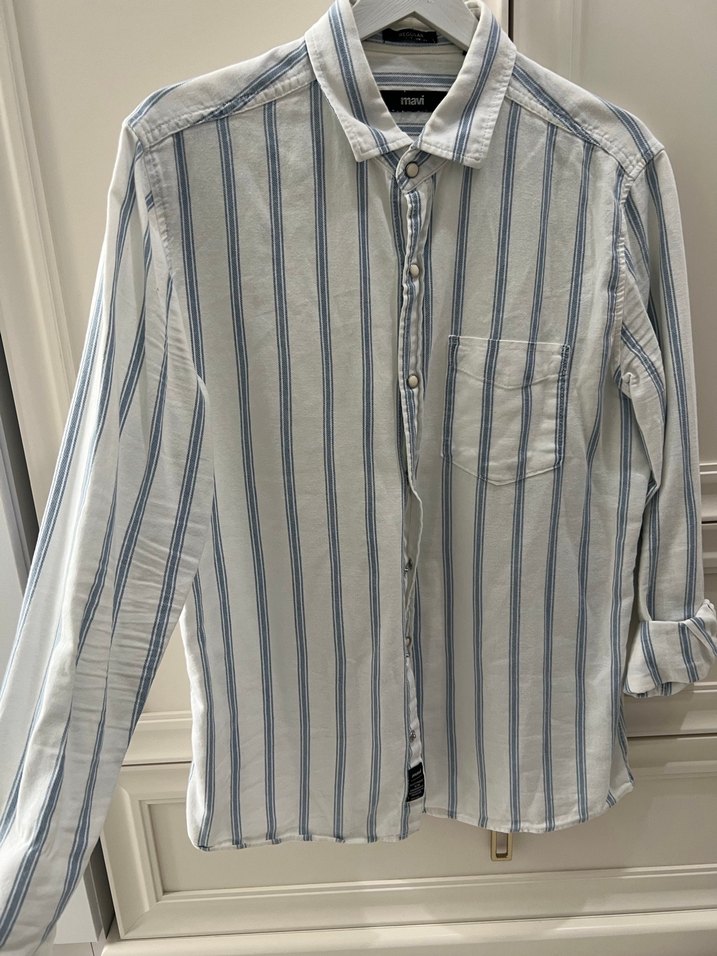 Düğmeli, uzun kollu ve yakalı bu erkek keten gömlek, rahat kesimi ve gri-beyaz çizgili deseniyle günlük sokak stiline uygundur.