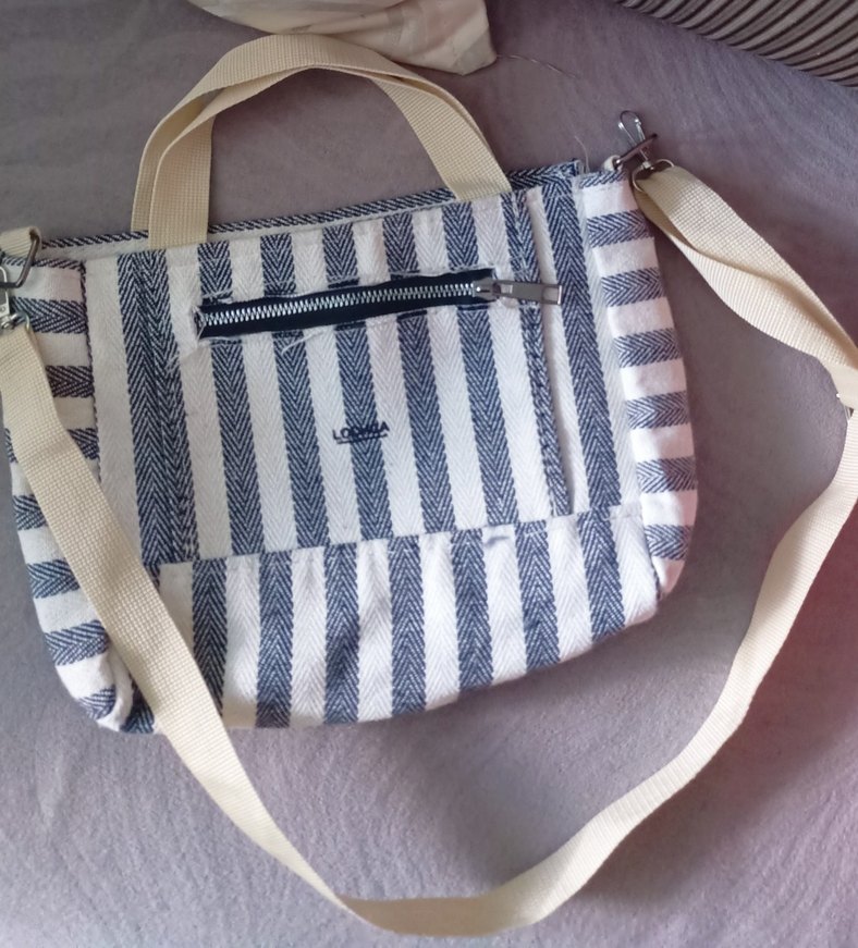 Kadın çantası, fermuarlı ön cep ve gri beyaz çizgili desene sahiptir. Kısa sap ve çıkarılabilir omuz askısı ile kullanışlıdır. Dayanıklı kumaştan, sokak stili için uygundur.