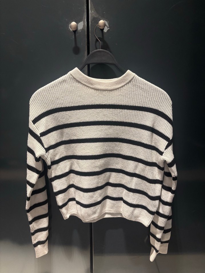 Gri ve beyaz çizgili, uzun kollu, bisiklet yakalı, vücuda oturan triko kazak. Günlük kullanım için midi boy, rahat sokak stili. 14+yaş kadın xs-s bedenlere de uygundur