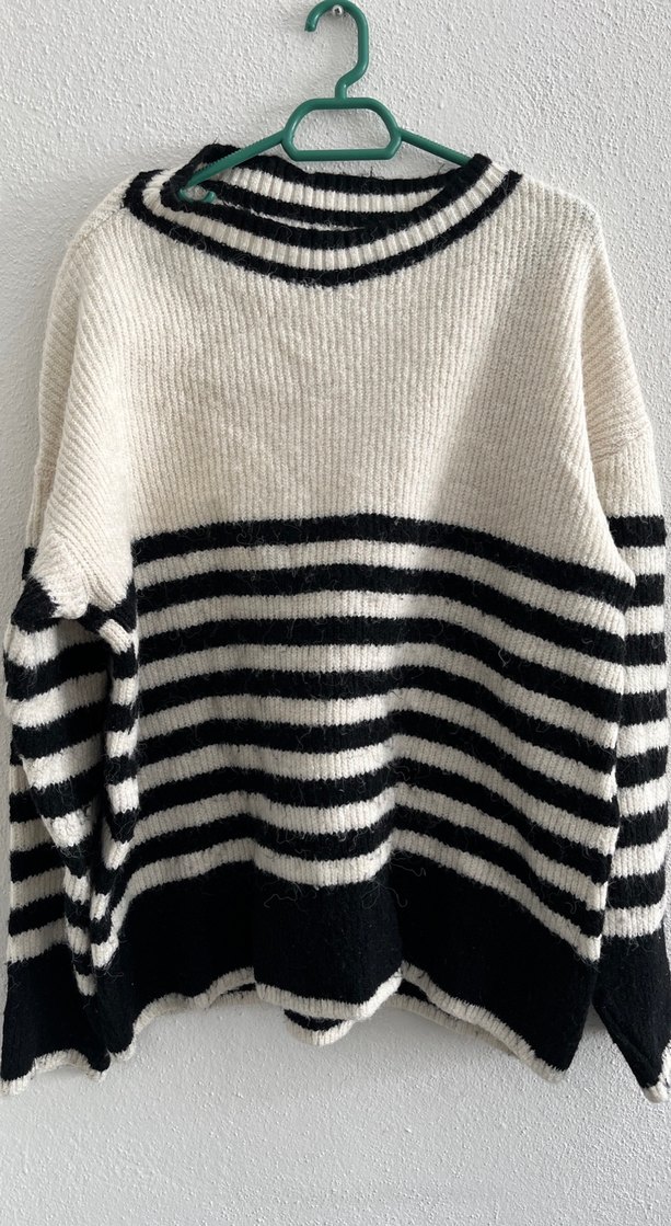 Bu kadın triko kazak, gevşek kesim, uzun kollu ve yuvarlak yakalıdır. Yumuşak örme kumaştan yapılmış, beyaz ve gri çizgili desene sahiptir. Normal boyu, rahat sokak stili için uygundur.